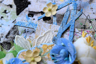 Having prepared all the pieces I postioned them on the page where I wanted them and layered everything. Adding embellishments and Blue Fern Studios flowers Spring Florals and Garden Blooms. As finishing touches I splattered a variety of mists.